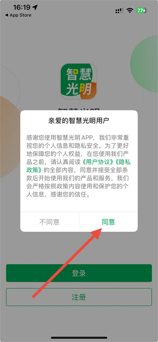 1、打开智慧光明后,点击同意用户协议和隐私政策的提示框。