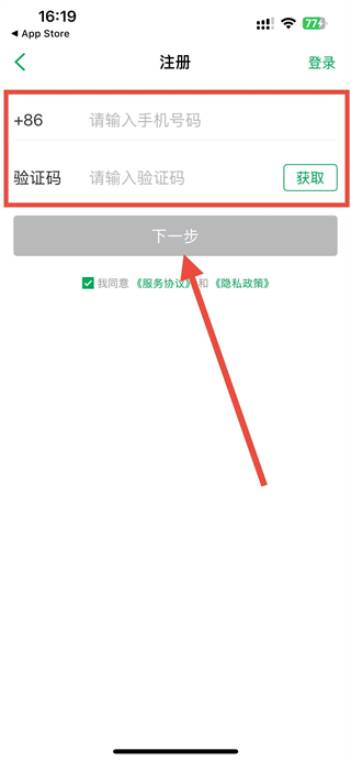 3、在输入框填写手机号码,获取验证码,点击下一步,按照后续提示补充信息,即可完成注册。