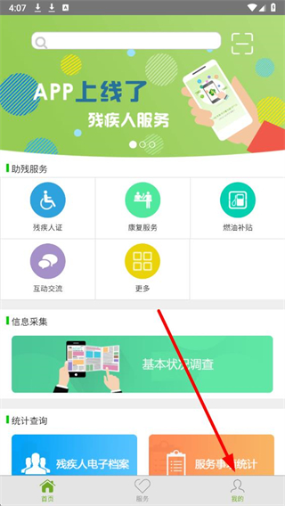 1、在残疾人服务app界面,找到底部导航栏我的选项,进入我的页面。