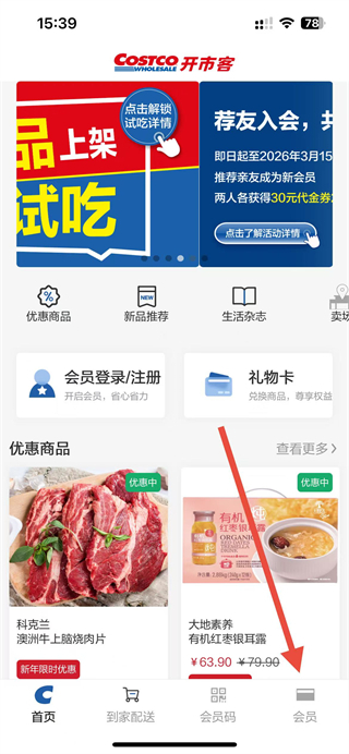 1、进入开市客APP,在底部导航栏,找到会员选项并点击,进入会员页面。