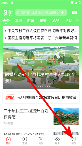 1、进入冀云客户端首页,点击底部我的按钮,进入个人页面。