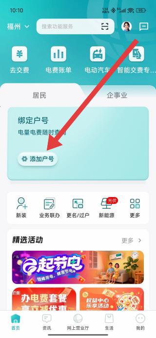 1、在首页居民板块点击“添加户号”按钮,进入户号管理界面,启动用电户号绑定流程。