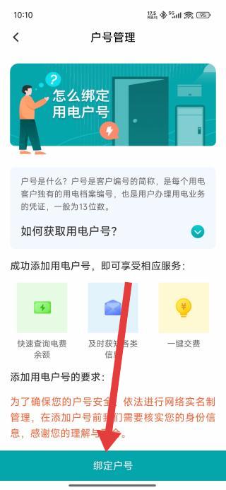 2、在户号管理页了解说明后,点击底部绑定户号,进入完善个人信息的页面。