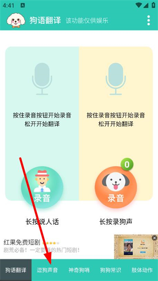 2、进入主页面后,点击底部导航栏的逗狗声音选项。