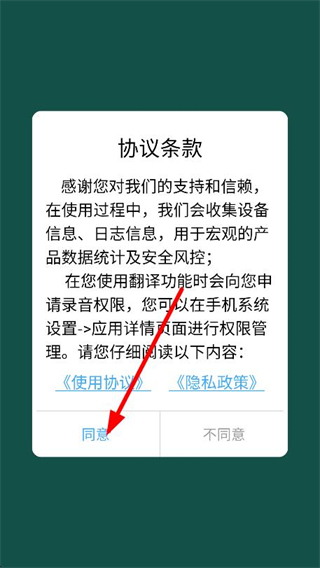 1、打开狗语翻译App,在协议条款提示框中点击同意。
