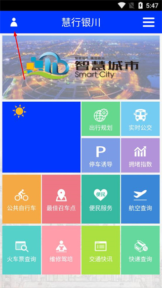 1、打开慧行银川软件,点击页面左上角的个人图标,展开个人中心相关选项。