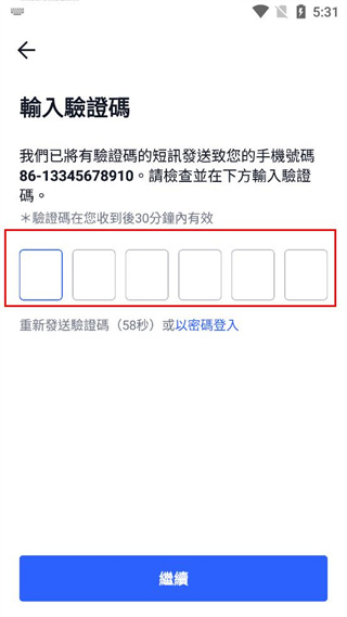 4、在输入验证码页面,填写收到的手机验证码,点击继续按钮完成登录操作。