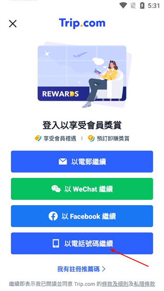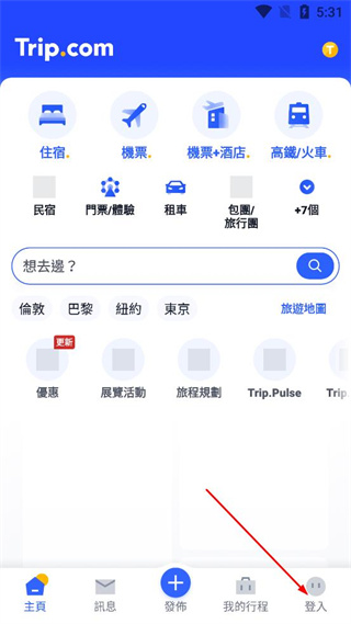 1、打开Trip.com软件,点击页面右下角的登入按钮,进入登录选择界面。