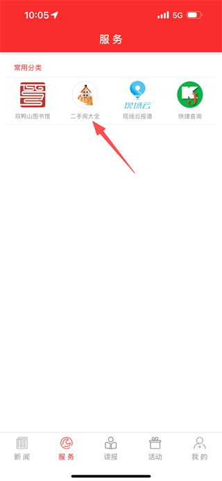 2、在服务页面,点击二手房大全的选项,进入二手房大全页面。
