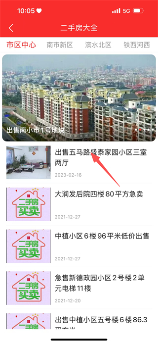 3、随后可点击出售五马路盛泰家园小区三室两厅条目,进入详情页面。