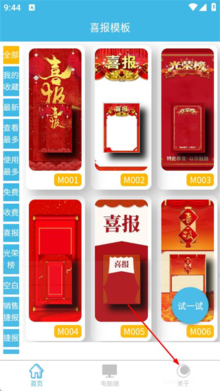 1、进入喜报模板后,点击底部的关于选项,可进入关于页面。