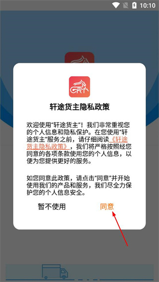 1、打开轩途货主应用,出现隐私政策提示弹窗,点击同意按钮,进入登录注册页面。