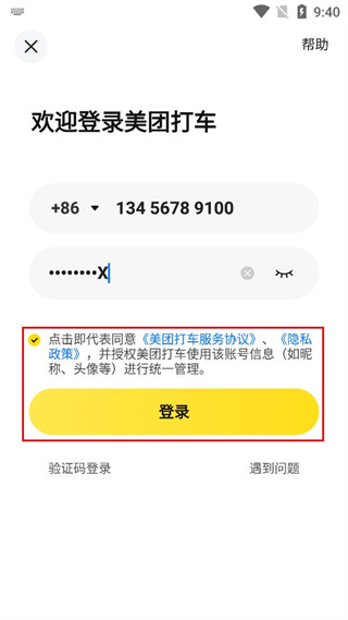 4、勾选同意相关协议及政策的选项,点击黄色的登录按钮,完成美团打车的登录。