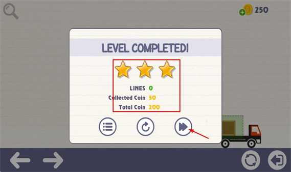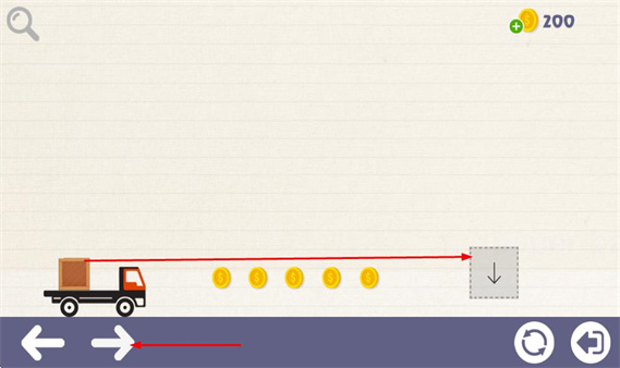 3、在关卡界面中,点击下方的向右箭头按钮,让载有方块的车辆移动,收集途中的金币。