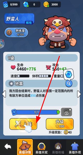 1、英雄界面选择对应的角色,点击上阵按钮将其部署到战斗阵容中,为后续对战做准备。
