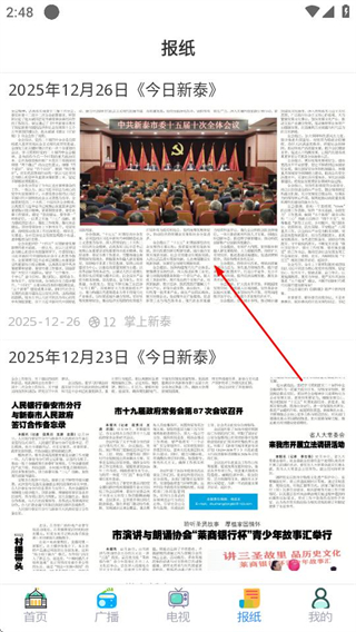 1、进入掌上新泰后,点击底部的报纸选项,可进入报纸页面。