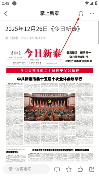 3、在报纸详情页,点击右上角的按钮,即可收听该报纸内容。