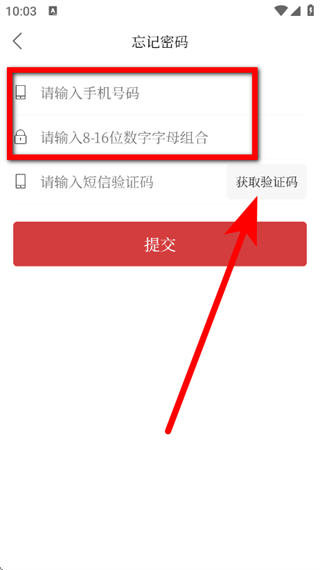 3、在忘记密码页面,输入手机号码、设置新密码,点击获取验证码。