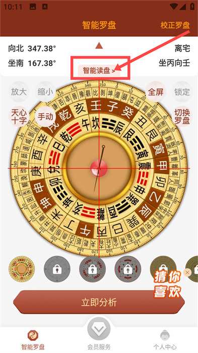 3、随后,大家通过对设备的转动,可以看到罗盘也在转动,这样能让风水检测更准确,想查看细节可以点击上方的【智能读盘】,如下图所示;