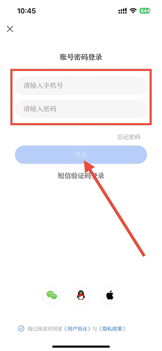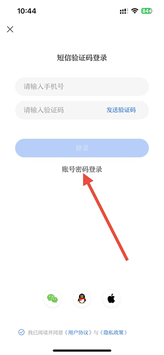 4、在账号密码登录页面,输入手机号与对应密码,确认已勾选协议后,点击登录完成账号登录。