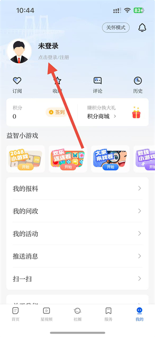 2、在个人页面中,找到点击登录注册选项并点击,跳转至账号登录的选择界面。