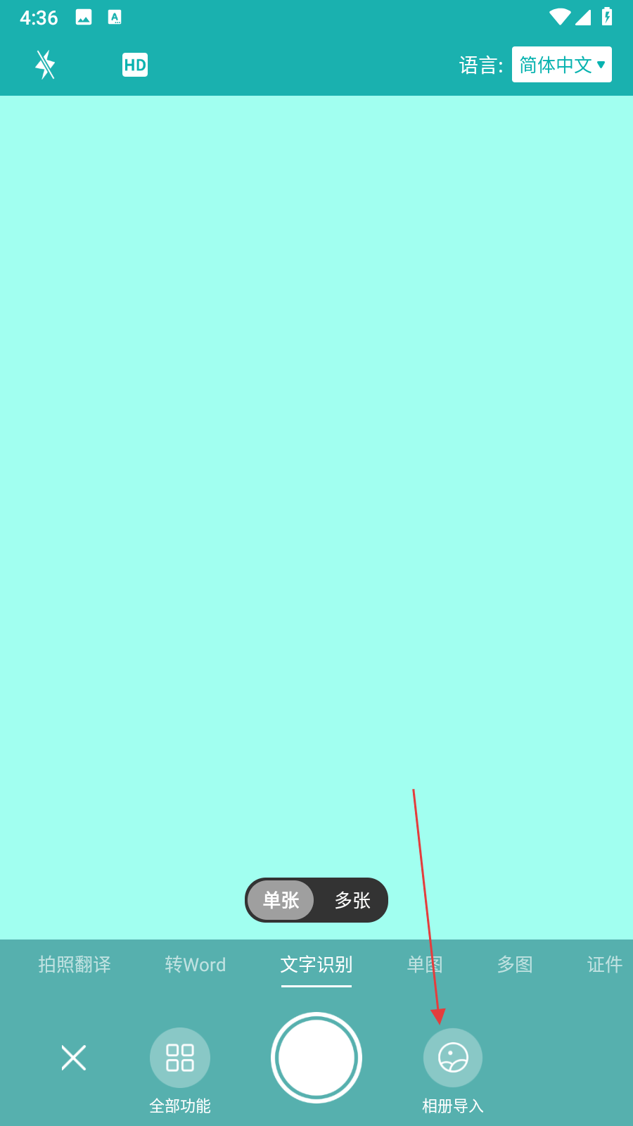 2、在文字识别操作界面,点击相册导入,从手机相册中选择需要进行文字识别的图片。