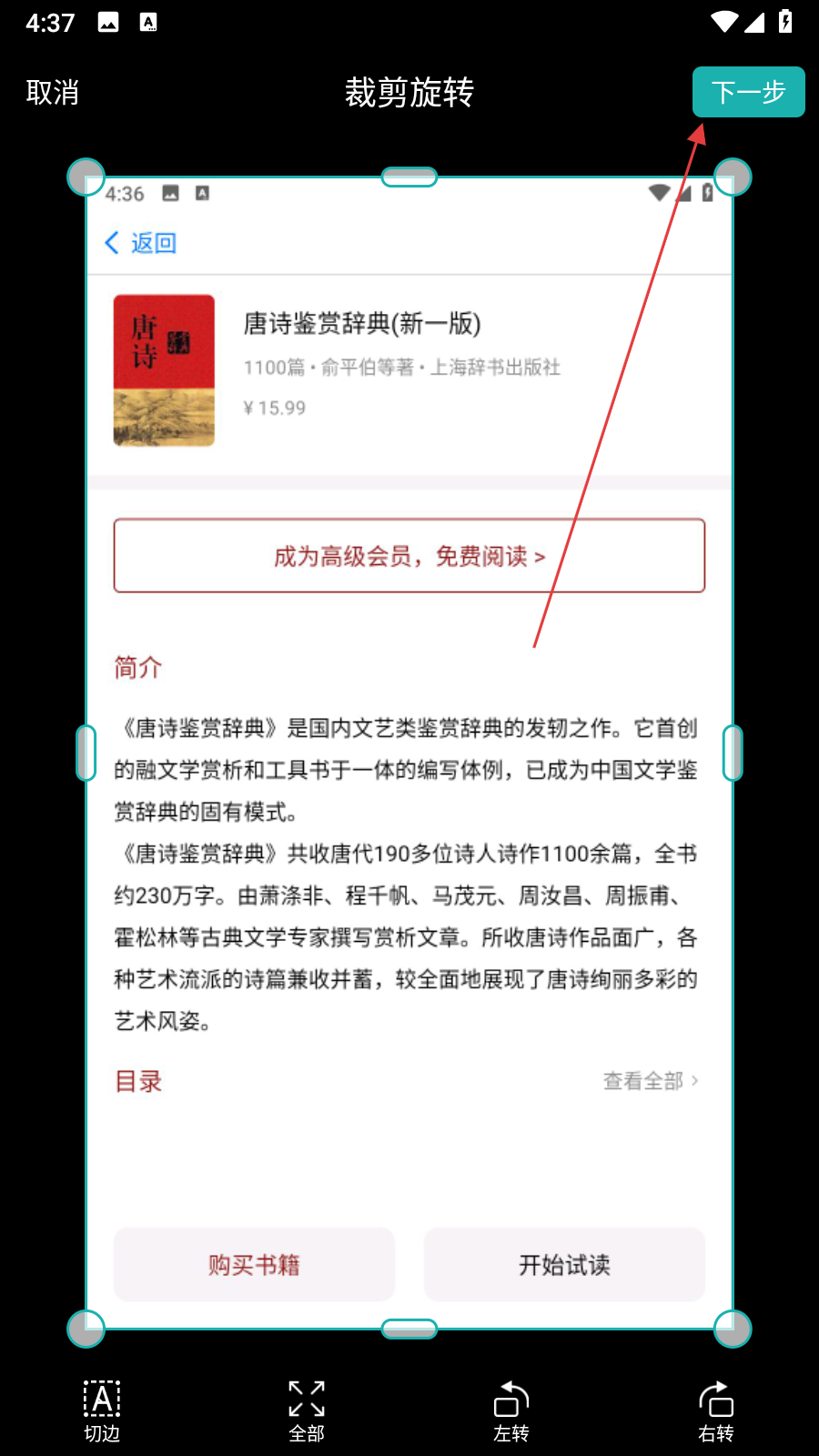 3、在裁剪旋转页面,调整图片的裁剪框,将需要识别的文字区域框选出来,调整完毕后点击右上角下一步。