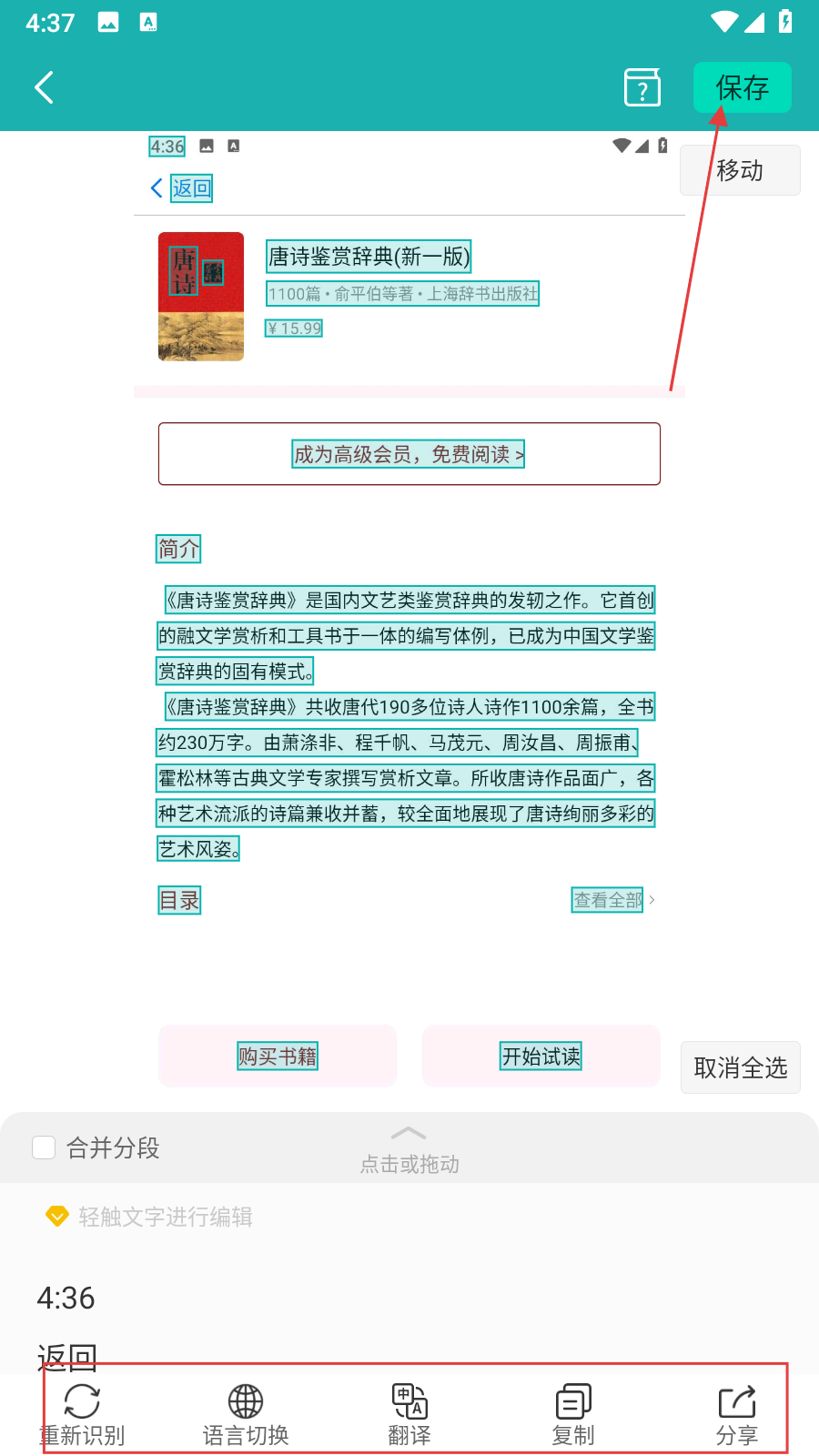 4、在文字识别处理页面,对识别出的文字进行编辑、复制、翻译等操作,最后点击右上角保存。
