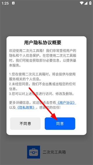 1、打开二次元工具箱,在弹窗中,点击同意按钮。