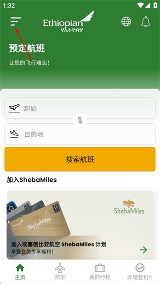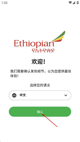 1、打开埃塞俄比亚航空应用,选择语言为中文后点击确认按钮,进入应用主界面。