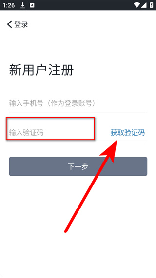2、在新用户注册界面的手机号栏填写手机号码,随后点击获取验证码。