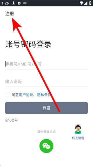 1、在万物在线的登录页面,点击左上角的注册,进入新用户注册界面。