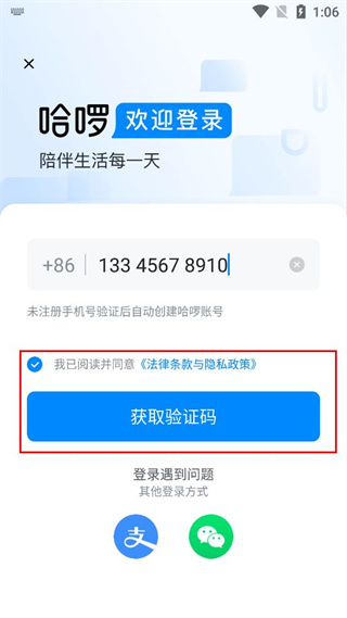 2、在登录页面的对应输入框,填写需要登录的手机号码,找到相关协议的勾选框。