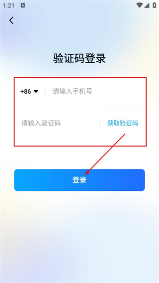3、在验证码登录页面,填写手机号,然后填写对应的验证码,完成登录。
