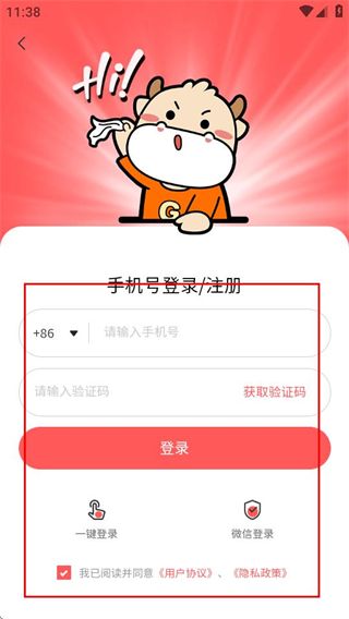 4、在手机号页面,填写信息并勾选协议后,点击登录按钮即可完成账号登录。