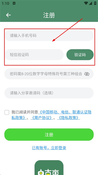 3、在注册页面,填写手机号码,再点击验证码,获取短信验证码。