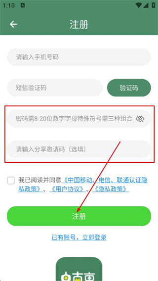 4、在注册页面,填写密码等信息,点击注册的按钮,来完成注册。