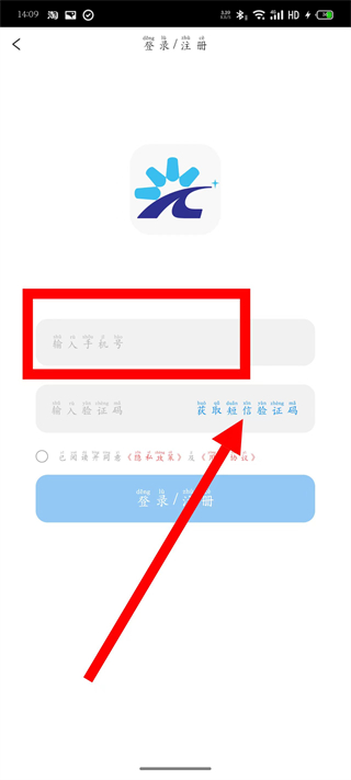3、在登录注册界面,输入手机号,点击获取短信验证码。