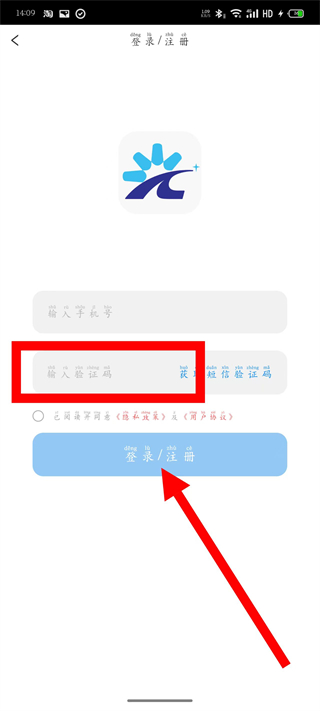 4、在输入验证码栏,输入验证码,点击登录注册,完成登录。