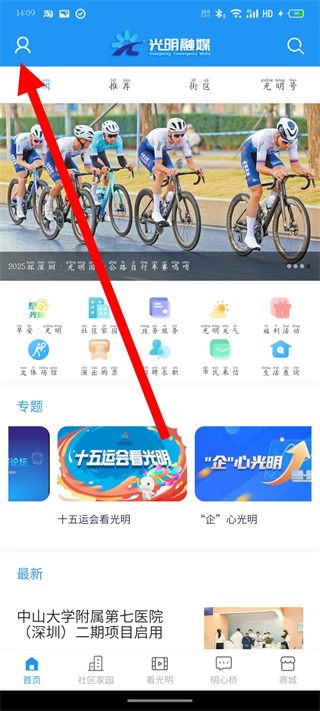 1、打开光明融媒,点击页面左上角的个人图标,进入我的页面。