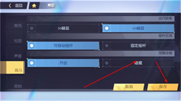 3、在战斗设置里找到“觉醒动画”选项,将其切换为“隐藏”,再点击“保存”按钮,即可关闭觉醒动画功能。