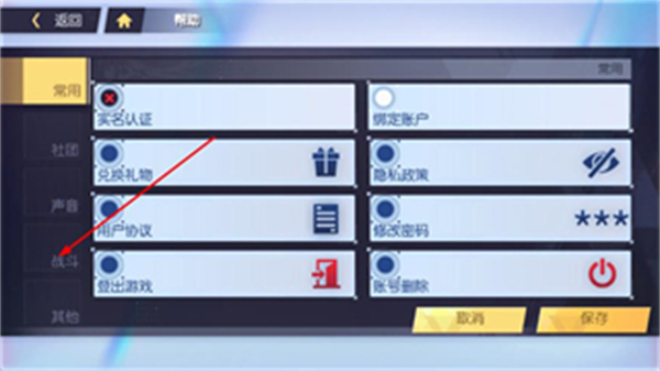 2、在设置页面的左侧选项中,选择“战斗”分类,进入战斗设置界面。