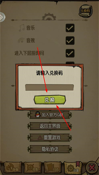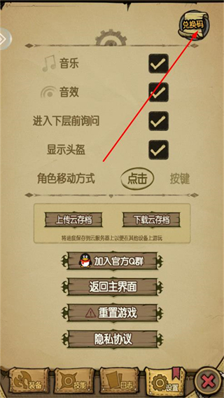 3、在设置页面的右上角,点击兑换码按钮,弹出兑换码输入窗口。