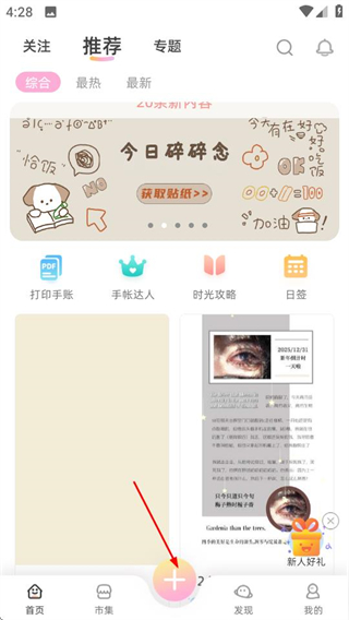 2、在创作菜单中,点击笔记选项,可进入图片选择页面。