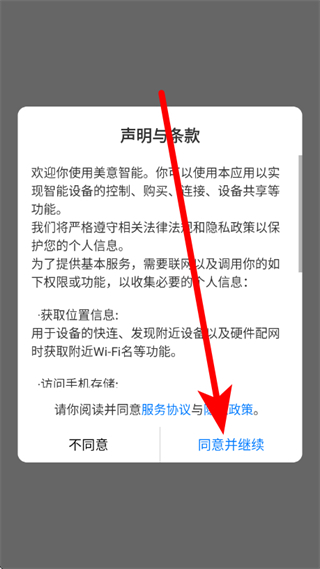 1、打开美意智能,在弹窗点击同意并继续,进入登录页面。