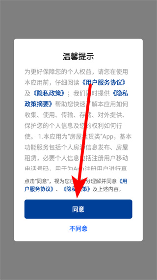1、打开贝壳租房后,弹出弹窗,点击同意,进入主界面。