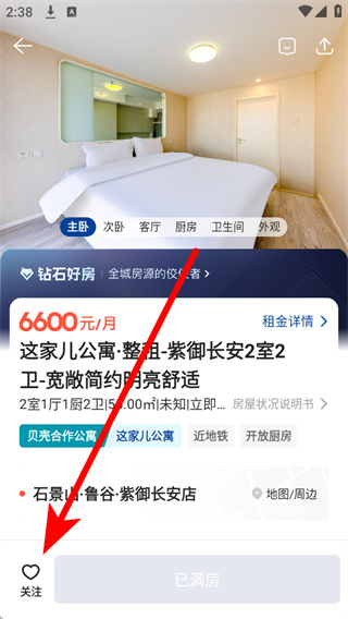 4、在房源详情页可查看租金、户型等信息,点击页面底部的关注。
