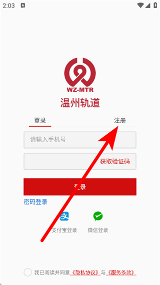 3、在登录页面,点击右上角注册选项,进入注册界面。