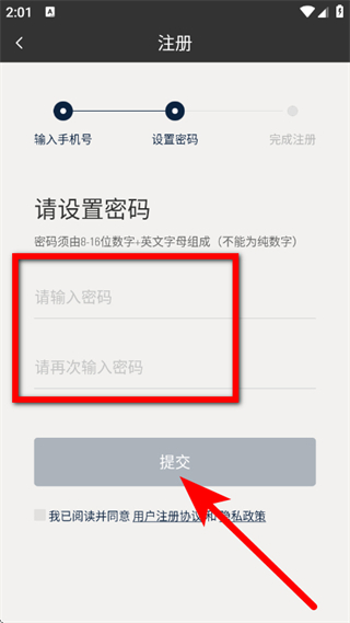 3、在请设置密码页面,设置密码,点击提交。