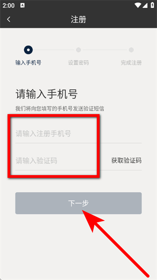 2、在注册页面,输入手机号和验证码,点击下一步。